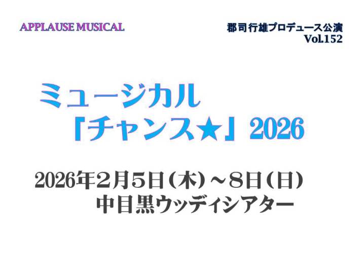 | ~APPLAUSEMUSICALinformation~ 【最新情報】 ◎公式X(@applause_fan)にて情報発信中! 【公演情報ページ 】⇒コチラ 郡司行雄プロデュース公演Vol.152 ミュージカル「チャンス☆」2026 製作総指揮・作・演出・振付・脚本:郡司行雄 音楽:玉麻尚一 共同プロデュース:大木香枝 ◆2026年2月5日(木)~8日(日) 中目黒ウッディシアター 2月5日(木)14:00(虹組)・19:00(空組) 2月6日(金)14:00(空組)・19:00(虹組) 2月7日(土)14:00(虹組)・18:00(空組) 2月8日(日)13:00(空組)・17:00(虹組) ◆料金 一部指定席(全席プログラム付) 指定席6500円 自由席 6000 【チケット予約】 ※発売中(~2/4) ●アプローズチケット (販売ページhttps://form1ssl.fc2.com/form/?id=8860fcf79aac9957 ●GETTIISオンラインセブンイレブンサービス (販売ページhttp://confetti-web.com/@/chance2026 ※「GETTIIS」(http [QRコード] [アプローズ] [ゲッティ] ![]() |